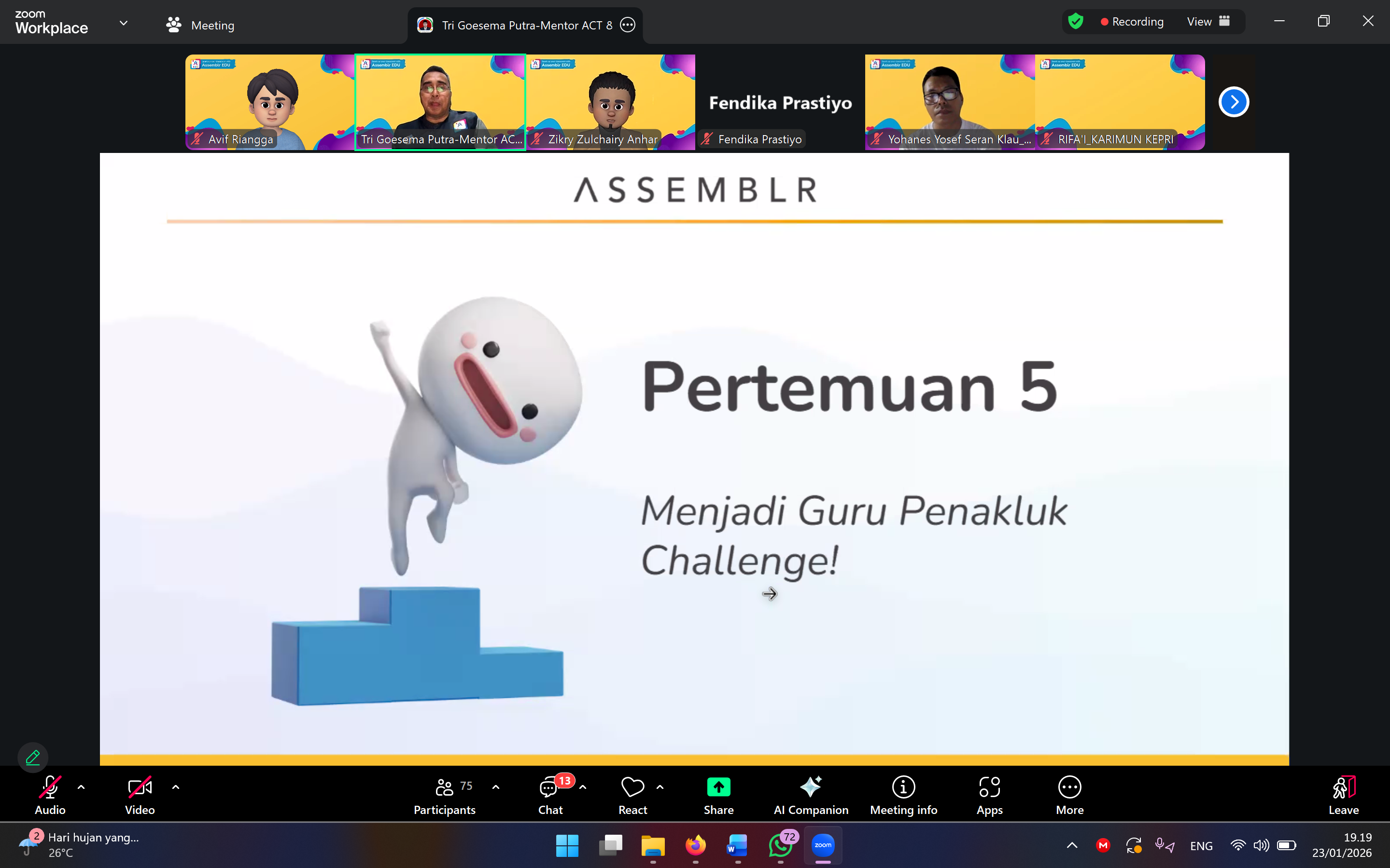 Hari kelima sekaligus hari terakhir Bootcamp Speed Up Goes to ACE Level 4 menjadi momen penutup yang penuh refleksi dan semangat baru. Sesi ini dipandu oleh Pak Tri Goesema Putra (ACE Level 18) yang memberikan sambutan hangat serta motivasi kepada seluruh peserta. Suasana kegiatan terasa istimewa karena peserta diajak melihat kembali perjalanan belajar selama lima hari, mulai dari pengenalan Assemblr EDU hingga strategi mencapai target ACE Level 4.